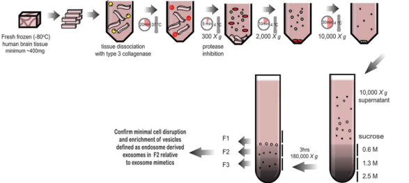 將新鮮冷凍(-80°C)人額葉皮質在冰上用剃刀刀片切片,產生1-2cm長、2-3mm寬的切片。冷凍切下的切片組織用75 U/mL 3型膠原酶在Hibernate-E中、37°C條件下消化20分鐘。消化后立即將組織放回冰中,加入蛋白酶和磷酸酶抑制劑。將組織在4℃下以300×g離心5分鐘(沉淀用作腦勻漿+膠原酶對照),將上清液轉移至新管中,在4℃下以2000×g離心10分鐘,然后在4℃以10,000×g離心30分鐘。將含有EV的上清液覆蓋在三重蔗糖墊(0.6M,1.3M,2.5M)上并以180,000×g超速離心3小時分離囊泡。棄去梯度的頂部,收集指定為1,2和3的級分并測量折射率。將每個級分進一步以100,000×g超速離心以沉淀每個級分中所含的囊泡。每個樣本均通過包括電子顯微鏡、RNA和蛋白質分析在內的技術組合進行驗證。注意:一些組織樣本不適合這種方法。取樣時間、儲存時間和凍融循環(huán)次數(shù)會對組織質量產生負面影響,并導致細胞碎片和非外泌體囊泡對組分產生污染。