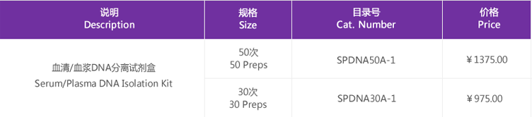 血清或血漿中游離核酸(Free-circulating nucleic acids)通常是小片段( DNA<1000 bp 或 RNA<1000 nt),另外,游離miRNAs可潛在作為疾病(如腫瘤)標志物,用于臨床診斷及用藥指導和病情評估。血清或血漿中游離核酸濃度通常較低,并且不同個體,不同狀態(tài)下含量不同。另外,在血清或血漿中含有大量的細胞分泌的胞外膜性囊泡(extrocellular visicles,EVs),在細胞間信息交流中發(fā)揮著重要作用,主要參與免疫抗原呈遞,神經(jīng)遞質(zhì)傳遞,脂類代謝,及細胞信號轉(zhuǎn)導等過程,并與多種疾病的發(fā)生、發(fā)展、治療及預后密切相關(guān)。在外泌體中已檢測到基因組DNA和線粒體DNA (Thakur BK et al.2014;Akiko Takahashi,et al.2017; Kalhert et al.2014),可作為目前液體活檢的補充,正被人們所認識和重視。 血清/血漿DNA分離試劑盒采用優(yōu)化的裂解液提取血清/血漿中DNA,通過特異性結(jié)合核酸的離心吸附柱和獨特的緩沖液系統(tǒng),可方便、快捷地純化、洗脫DNA,可直接用于下游應用,如realtime PCR,基因突變檢測,NGS 測序等。